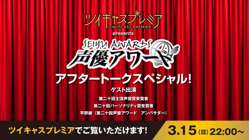 NEWS, TOPICS 《第二十回 声優アワード》 アフタートーク配信決定‼️ 2026年2月18日 / 《第二十回 声優アワード》 アフタートーク配信の実施が決定‼️ アンバサダーを務める平野の出演が発表されました! 『ツイキャスプレミア presents 声優アワードアフタートークスペシャル!』 日時:3月15日(日)22:00~23:00予定 配信:ツイキャスプレミア チケット:500円(税込) 授賞式後の生配信! 是非ご覧ください! チケットの購入はこちら! ツイキャスプレミアpresents声優アワードアフタートークスペシャル!その年度に最も活躍し、人気、実力をともに兼ね備えた声優の方々、そして長年にわたって活躍するベテラン声優の方々が一堂に顔を揃える声優界最大のイベント「声優アワード」。20回目を迎える声優アワードでは、今年度新たな試みとして授賞式後の「アフタートーク配信」..premier.twitcasting.tv 詳細はこちらから! 『ツイキャスプレミア presents 声優アワード アフタートークスペシャル!』実施決定! | 文化放送20回目を迎える声優アワードでは、今年度新たな試みとして授賞式後の「アフタートーク配信」の実施が決定しました。 ゲストとして、第一回の新人女優賞の受賞者で、第二十回のアンバサダーを務める平野綾の出演。その他、3月15日(日)当日に発表される受賞者の中から、主演声優賞・パーソナリティ賞の受賞者がゲスト出演予定です。www.joqr.co.jp
